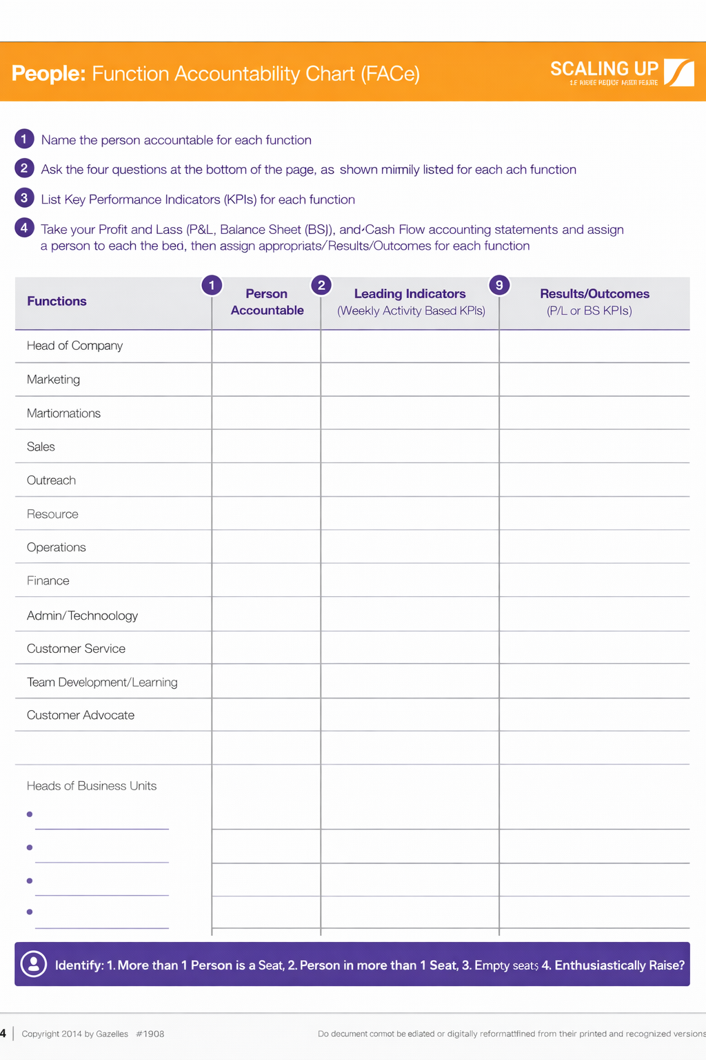 The FACe breaks your business down into its key functions—think Sales, Marketing, Operations, Finance, and HR – and identifies who is ultimately accountable for each area.